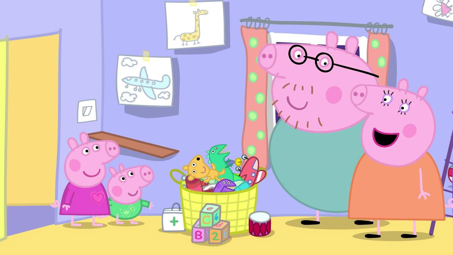 The building’s wrapped up, so Peppa and George move on to fitting out their attic rooms. George opts for a dinosaur look, and Peppa picks her own style. (Series 8, episode 3)